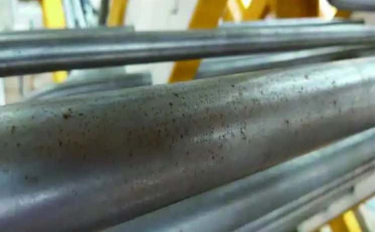 阴极保护电流对不锈钢钝化膜的影响较为复杂,极化电位不同可能会导致表面钝化膜变化。钝化膜在双相不锈钢管线整体防腐蚀体系中仍然发挥着重要的防护作用,特别是对于欠保护或电流屏蔽处管线。游离铁会导致双相不锈钢表面污染从而影响钝化膜的形成,如图5所示。双相不锈钢管线的表面处理和喷涂应在独立的车间或专用场地进行,喷砂和作业环境均需与碳钢作隔离处理。